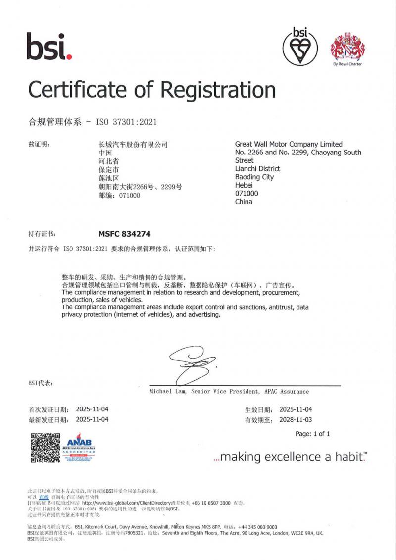 The British Standards Institution (BSI), renowned as the "Origin of Standards," holds a pivotal position in the world of standards. As the world's first standards institution of national level, and one of the founding members of the International Organization for Standardization (ISO), BSI is highly respected for its professionalism and rigor. Having successfully passed BSI's stringent assessment, GWM received the ISO 37301 certificate issued by BSI bearing the accreditation of the ANAB (ANSI-ASQ National Accreditation Board), which serves as a widely trusted "passport" for GWM in global markets.