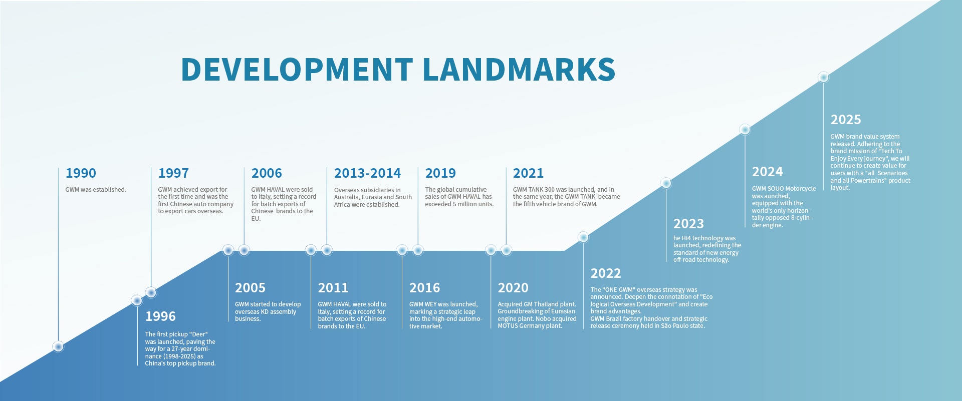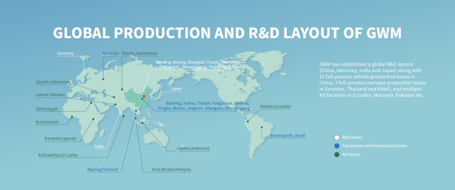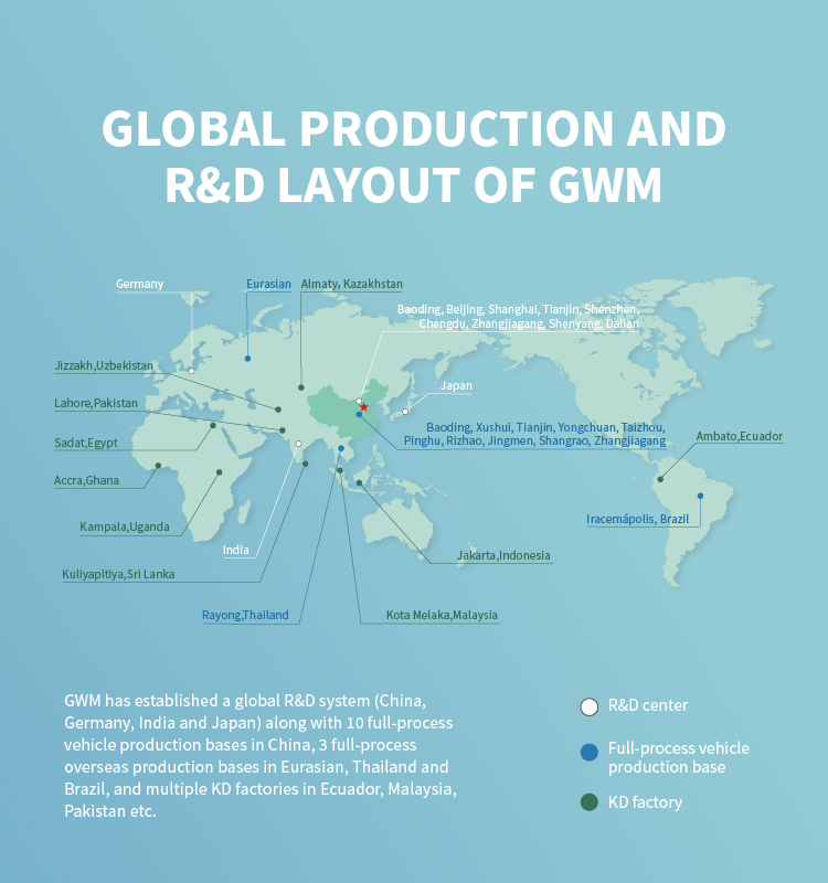 In China, GWM has 10 major full-process vehicle production bases. outside of the Mainland China, GWM has established full-process vehicle production bases in Eurasia, Thailand, and Brazil, and has several KD factories in Ecuador, Pakistan, and other places.